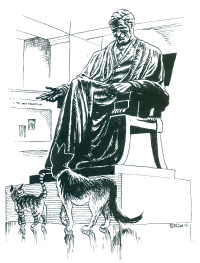 May I help you? the feline figure inquired calmly as if it were routine to meet a cat and a dog wandering around the courtroom at night."