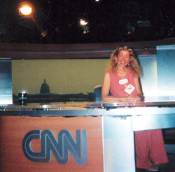 Newscasting from D.C.--Janice Law poses on the CNN newscaster's set with capitol dome in background during tour. |